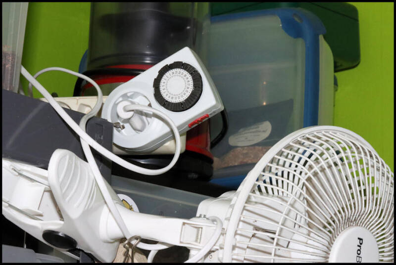 Tegenover de bakken van de Merulanella’s bevestigde ik, op dezelfde hoogte als de bakken, een kleine ventilator. De afstand van ventilator tot bakken is iets meer dan 1 meter. Ventilator staat op de laagste stand en wordt aangestuurd via een tijdklok. De ventilator gaat om de twee uur een half uur aan, dag en nacht. In de voorkant van de bakken zit een ventilatieopening waardoor de frisse lucht op lage snelheid naar binnen gaat. En weer via de andere ventilatieopeningen naar buiten gaat. Aangezien de warmte van de onderkant komt heeft de “wind” weinig tot geen directe invloed op de temperatuur.