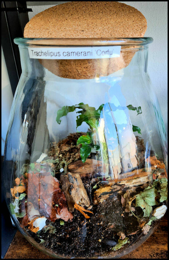 Half september 2021 heb ik ze overgeplaatst in een plantterrarium in onze keuken (leefomstandigheden zijn min of meer gelijk als in de standaard bak (2/3-1/3), maar de temperatuur in de keuken zal zorgen voor minder afkoeling dan op zolder).