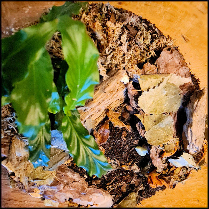 Deze fles is ingedeeld met een vochtig deel van 1/3 van de bodem waarin een plantje staat met daaromheen vochtig sphagnum. De overige twee derde van het substraat gaat over van licht vochtig naar droog. Hierop liggen stukjes schors als schuilplaats en bladeren. De samenstelling van het gebruikte substraat vind je op de substraat pagina.